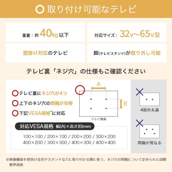 ※32~65型テレビのVESA規格に対応しています。